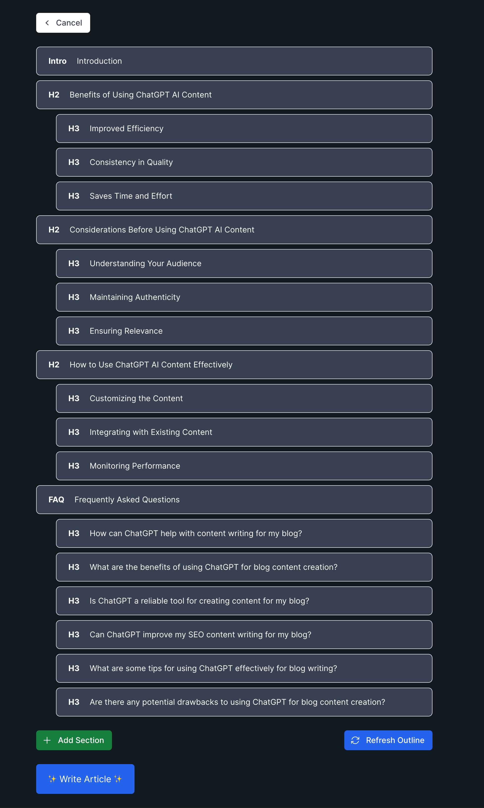 Now that you’ve instructed how you want your article to be set up, AI writers will then propose an outline based on competitive websites ranking for the same keywords. You can edit these until you are happy before generating your article.