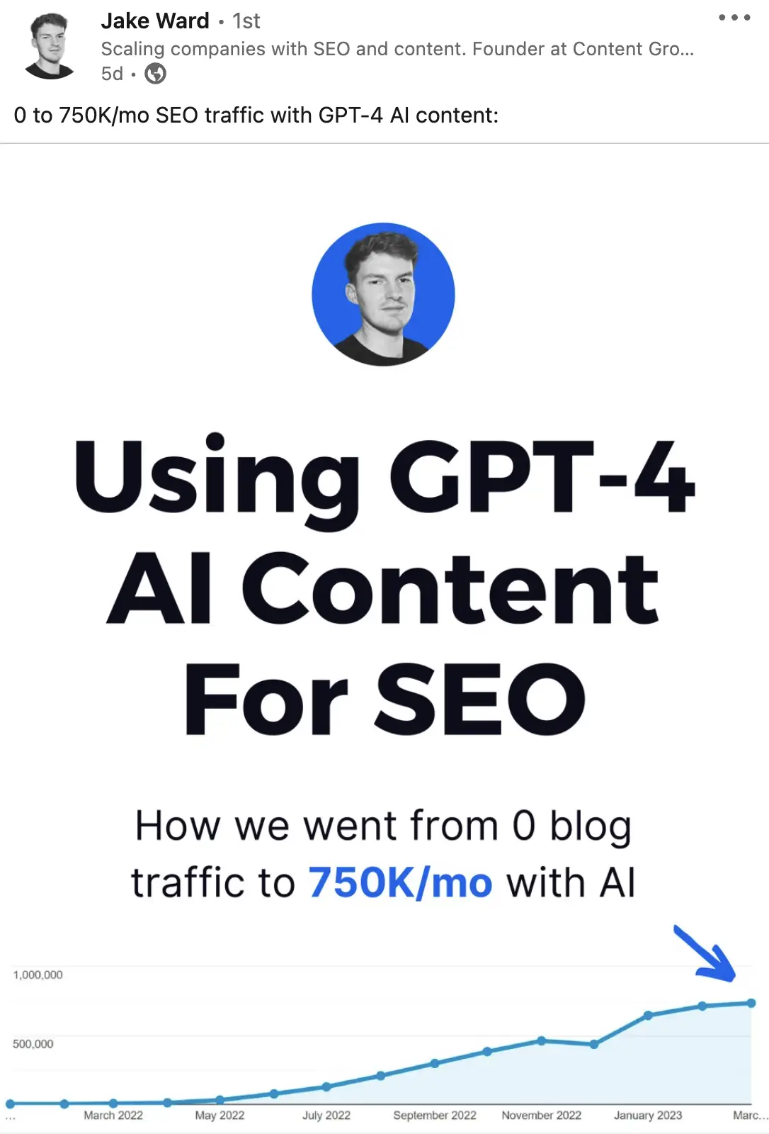 In that vein, there was a post on LinkedIn talking about using 100% AI content that was generating 750,000 visitors and ranking for thousands of keywords, that was the hook that got me thinking.